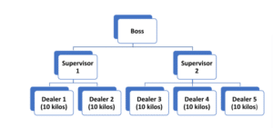 Here is an example of an organization with a Boss at the top, two Supervisors in the middle, and five Dealers at the bottom. Each Dealer does drug deals that total 10 kilos.