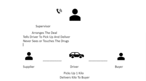 Here is an example. Let’s say a Supervisor in a drug organizations finds out that a Buyer wants a kilo of drugs and will pay a certain amount for the kilo. The Supervisor then contacts a Supplier, who is willing to sell a kilo for less than what the Buyer will pay. This means that the Supervisor can make a profit from buying a kilo from the Supplier and selling it to the Buyer. The Supervisor then arranges a purchase from the Supplier and a sale to the Buyer. Of course, the Supervisor does not want the Buyer to know who the Supplier is, because then, the Buyer could go directly to the Supplier and cut out the Supervisor. So, the Supervisor sends a Driver to pick up the kilo from the Supplier and to deliver it to the Buyer. Here is a diagram showing how this would work: